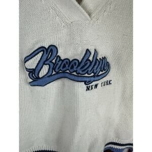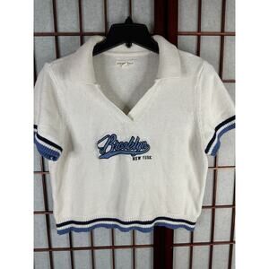 This stylish sweater polo features a cropped length and a cool Brooklyn graphic, perfect for adding a trendy vibe to any outfit.