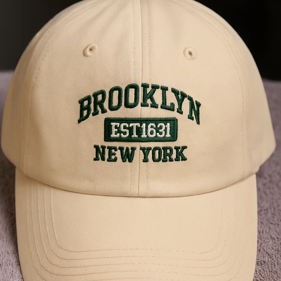 Classic Brooklyn New York cap featuring bold green embroidered lettering on a beige base. Adjustable back strap for a perfect fit. Great for casual wear, streetwear, or as a stylish everyday accessory.