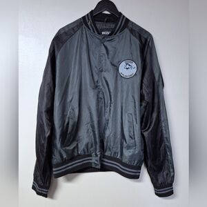 Brooklyn Standard Hidden In Plain Sight Snap Button Windbreaker Lightweight Bomber Jacket with BS Pin attached on the neck of the Jacket