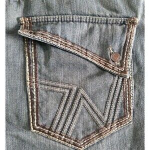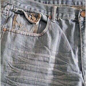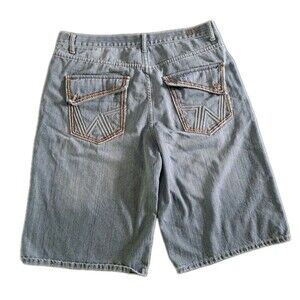 Brooklyn Xpress mens blue denim shorts (jorts), size 40. Classic baggy fit with a distressed look, perfect for vintage streetwear, grunge, or hip hop Y2K fashion. Rear left pocket is missing a button (see photos). Pre-owned with normal wear from use.