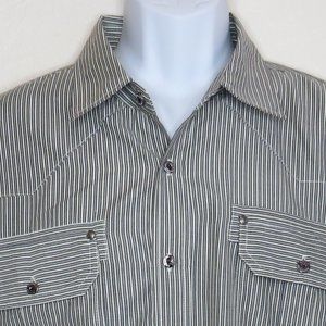 Pre-Owned Condition! 60% Cotton/40% Polyester. Handsome Gray & White Stripe Chrome LOGO Brand Color Button Down Double Chest Pocket Shirt. Excellent Detailed Shirt.