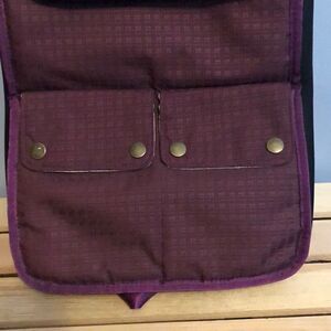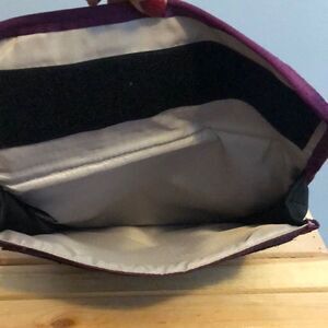 This is incredible!!!!! It’s in like new condition with an adjustable strap. It is insulated and has 3 exterior pockets. It’s a very deep purply color. Grab it!