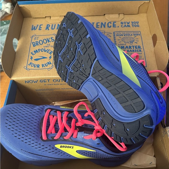 Brooks trace 2 neutral sneakers great for walking and on your feet all day activities. Size 7 women’s trendy blue, pink laces and neon yellow brooks logo cushion in every step!!