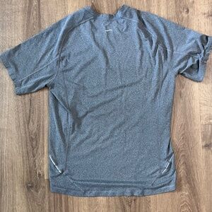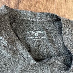 Brooks workout shirt with a v neck. Soft grey color and size M. There are reflective details on the bottom hem of the shirt and the name and logo are also reflective for walking/running. Nice stitch construction for active workouts.