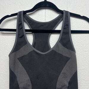 Brooks women's compression tank top in black & charcoal gray. Scoop neck. Wide straps. Racerback. Thick material. Has snags. Sold as is. In good used condition. No stains, tears or holes.