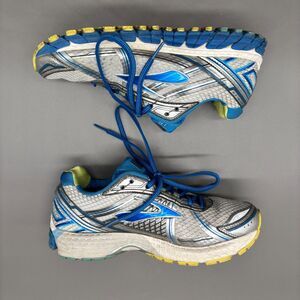 Pre-owned Brooks Adrenaline GTS 15 running shoes in womens size 9 (Medium width). These are gray and blue with yellow accent. Road running sneakers with DNA cushioning for support and comfort. Uppers are in good condition with typical signs of use. Insoles are original and included. Outsoles show moderate wear but still have life left. Interior lining has some pilling (see photos). Great everyday trainers or backup pair.