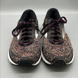Confetti colorway. These Brooks are very clean and show just minor wear. Fun and functional Brooks Runnjng Shoes.