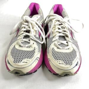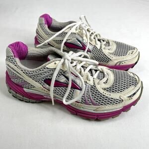 Brooks Adrenaline GTS raspberry pink and white walking/running sneakers. Great arch support. Worn a few times and has some slight yellowing on outside but still in overall great condition! Size 7.5