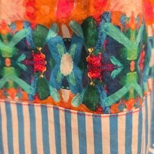 Digitally printed with original prints, batik-style main print, blue/white stripe at waistband and hem, 100% cotton