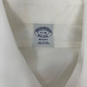 This is a pre owned Brooks Brothers 17-36 Solid White Long Sleeve Button Up French Cuff Regent Dress Shirt. This item is in good condition with minimal or no signs of use.