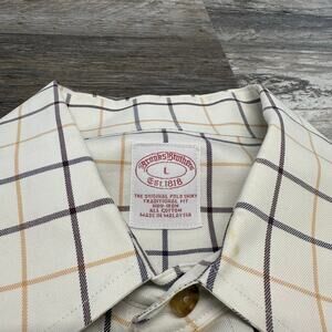 Brooks Brothers 1818 Cream With Black Yellow Plaid White Mens L Window Pane Non Iron Button Down Shirt collared cotton button-down single pocket on left chest curved hem buttoned cuff 100% cotton corpcore career classic office formal preppy