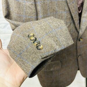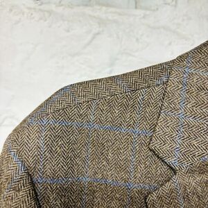 Brooks Brothers 1818 Madison Windowpane Herringbone Wool Blazer Suit Jacket 45R. Brown herringbone fabric with blue windowpane pattern, cupro lining, two button closure, single vented, show button cuffs.