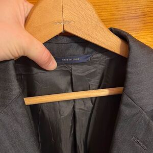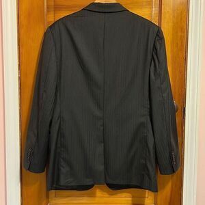 Excellent condition fine Italian wool two button suit jacket in a dark grey color with slight striping. There is some sticker residue on the lining that should come out easier once dry cleaned. The labels say both 42R and 42S but I believe the 42R is correct. Measurements taken flat are approximately 20.5” across chest, 18” across shoulders, 19.5” across waist, 29” long, 23.25” long sleeves from shoulder to sleeve hem.