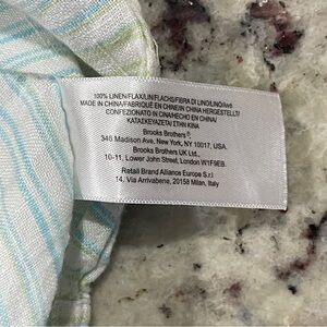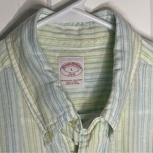 Brooks Brothers 346 100% Linen Large Green Blue Stripe Short Sleeve Button Up