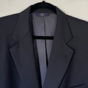 Classic navy blue wool sports coat with two gold buttons. Single back flap.