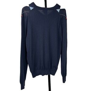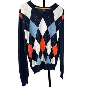 This Brooks Brothers 346 long-sleeve pullover in a mens size large delivers timeless preppy style. It features a rich navy base with a classic argyle diamond pattern in light blue white and orange crafted from breathable cotton-cashmere for luxurious softness that stays cool. A flattering v-neck silhouette with ribbed hems ensures a clean fit and elevated look perfect for layering over shirting or pairing with chinos and loafers. Hand wash care preserves the fine feel and ensures this sweater looks as good in seasons to come as it does today. Whether youre dressing for weekend golf or a smart casual office this sweater adds refined comfort and Ivy League charm to your wardrobe.