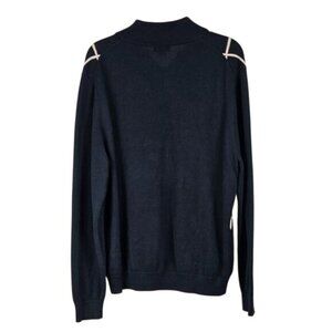 This sweater is made of 100% Supima Cotton, and is soft and comfy. Navy blue with pink on the collar and pink diamond pattern on the front. Half Zip with leather zipper tab.