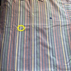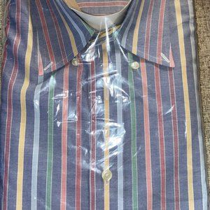 MensSupima Cotton "Non Iron" button down shirt. Light blue long sleeved shirt with multi color stripes. Please note there is one little hole shown in the third photo.