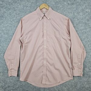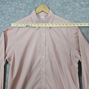 This is a Brooks Brothers 346 button down shirt with a red & white mini checkered pattern. It is all cotton, non-iron and the tag size is 16 - 4/5. This was a former work shirt. It has a nametag typically used by uniform companies on the inside bottom, shown in the photos. It is still in good pre-owned condition.