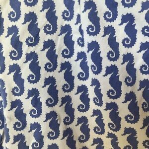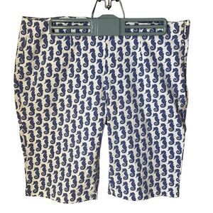 Brooks Brothers Natalie Fit Seahorse Shorts. Size 8 White with periwinkle seahorses all over. Hidden side zip closure. Reworked pants cut into bermuda length. Some stretch. Flat lay 17” W, 19.5” L, R 9.5”, I 10”. #seahorses #preppy #mermaidcore