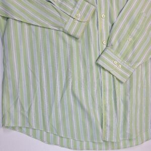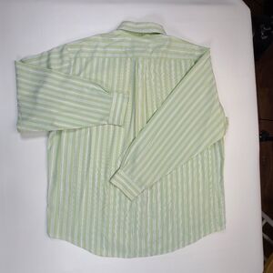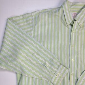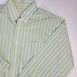 Brooks Brothers 346 Original Polo Shirt All Cotton No Iron Long Sleeve Striped Button Down Collar Shirt in Light Green, Blue and White Vertical Stripe Pattern