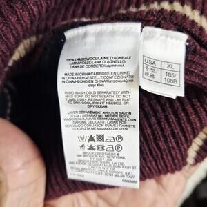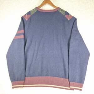 Color/Pattern: Navy blue base with burgundy and green argyle front, V-neckline, ribbed cuffs and hem
