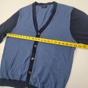 This is a Brooks Brothers 346 cardigan sweater for men in size L. The sweater features a color block design in medium blue/navy blue, with tortoise pattern buttons and a tight-knit V-neck style. Made of a cashmere and cotton blend, this classic fit sweater is suitable for various occasions such as travel, parties, casual wear, formal events, or business settings.