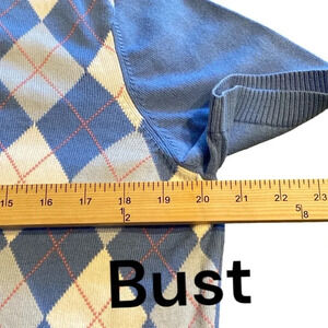 365 Brooks Brothers argyle short sleeve sweater made of 100% supima cotton. Blue, white and pink. Sleeves are solid blue.