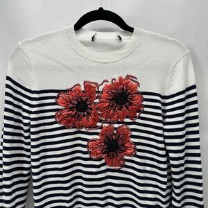 Excellent pre-owned condition. The 3D poppy design on a white and navy striped background creates a colorful and playful look. The crew neck and long sleeves make it perfect for cooler weather, while the casual sleeve type and tight-knit cotton fabric ensure both comfort and style. A classic and timeless piece.