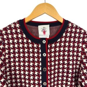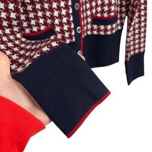 Navy, red and white knitted houndstooth design 8 button front, 2 front welt pockets, and 2 button cuffs. Crew neck