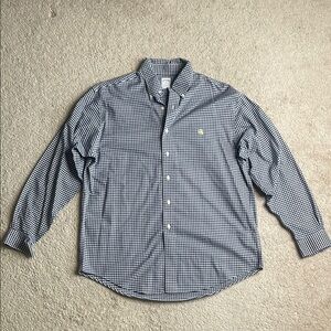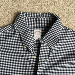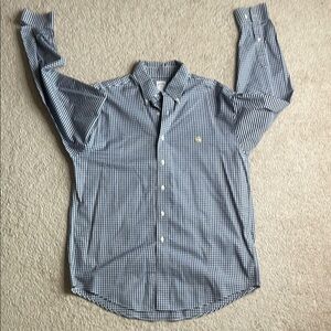This Brooks Brothers shirt features a classic button-down design in a versatile blue shade, perfect for casual outings. Made from high-quality materials, it offers comfort and style for everyday wear. The shirt's simple yet elegant look makes it a staple piece in any wardrobe.