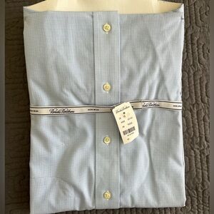 Classic Brooks Brothers dress shirt in a subtle blue checkered pattern. Ideal for formal and casual settings. Features a button-down collar and front pocket. NWT. In great condition - no holes or stains. Comes from a smoke free home.