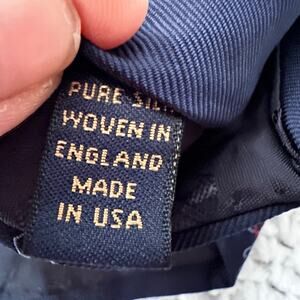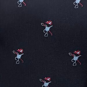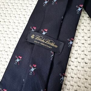 From Brooks Brothers. 100% silk. Woven in England. Made in USA. Navy blue classic tie with equestrian themed print of a rider's hat, saddle and riding crop in red and light blue coloring. Preowned in good condition with no stains or tears.