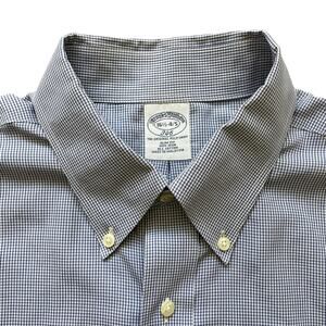 Pair of two blue and white button down non-iron long sleeve dress shirts by Brooks Brothers size 16.5 - 4/5. One is a blue and white pinstripe Regent style with front pocket, and the other is a 346 slim fit blue and white small grid check. 100% cotton, great clean preowned condition.