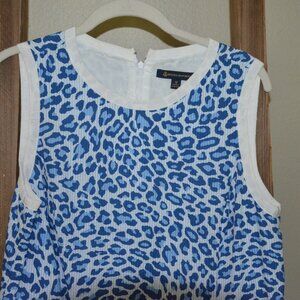 Stylish mini dress with a vibrant blue and white pattern. Sleeveless design. Perfect for casual outings.