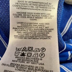 This Brooks Brothers polo shirt features a vibrant blue base with crisp white stripes, offering a classic and sporty look. Crafted from a comfortable cotton blend, it is perfect for casual outings or a smart-casual ensemble. The short-sleeved design and classic polo collar add to its timeless appeal.