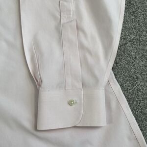 The Brooks Brothers Classic Non Iron Dress Shirt in men's size 18 features Supima cotton fabric in a light pink color. This solid shirt has a collared neckline, long sleeves, and a button closure. It is designed for formal occasions like weddings, parties, business events, and everyday wear. With its classic style and non-iron feature, this dress shirt is versatile for all seasons and easy to care for with machine washability. This shirt also includes pockets and a barrel cuff style for a timeless look.