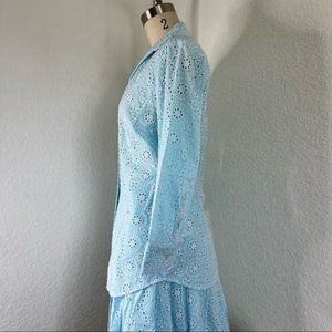 Add a touch of sweet summery style with this intricate floral eyelet blouse. Crafted from pure, lightweight cotton, this breezy shirt features a point collar, three-quarter-length sleeves, genuine mother-of-pearl buttons, shaping darts and a shirttail hem.