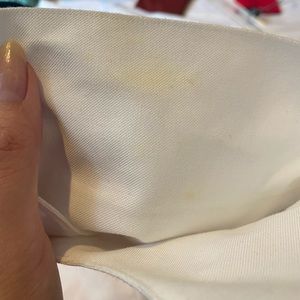 Fitted. Supima Cotton. Some yellow stains on inside of sleeve cuff - fine on outside though. Pink and white vertical stripes.