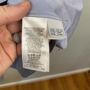 This Brooks Brothers dress shirt in blue is the perfect addition to any wardrobe. With a classic check pattern, long sleeves, and a collared neckline, it is suitable for any occasion, from formal events to business meetings to parties. The shirt is made of 100% cotton and has a woven fabric type, making it breathable and comfortable to wear all year round. It also features a button closure and accents, as well as a point collar style and barrel cuff top style. The shirt is available in size 16.5 and has a regular fit. Additionally, it has pockets and is non-iron, making it convenient for travel and everyday wear. The Brooks Brothers Madison model is a preppy classic that will never go out of style.