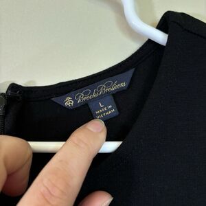 This beautiful Brooks Brothers dress is a must-have for any fashion-forward woman. The sleeveless shift style is perfect for warm weather and the round neckline adds a touch of sophistication. The dress features a zip closure and pockets for added convenience. It comes in a stunning black color with gold accents and is made of a combination of nylon, spandex, and rayon for a comfortable fit. The dress is ideal for various occasions such as travel, parties, and casual outings. It has a short length and is designed with a modern theme in mind. The dress is dry clean only and is available in a women's regular size large. Purchase this designer piece today and elevate your wardrobe to the next level!