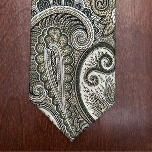 This luxurious tie from Brooks Brothers showcases a bold paisley pattern in a refined green and cream color palette. Crafted to add a touch of elegance, it is the perfect accessory to enhance any formal ensemble.