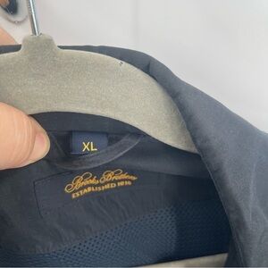 Brooks Brothers Jacket Men's XL Black Longline Long Sleeve Collared Full Zip /snap. Polyester with polyester lining. Snap cuffs. Front slip and Flap pockets. Drawstring waistline. Chest 58. Length 36. Measurements are approximate. Very good preowned condition.
