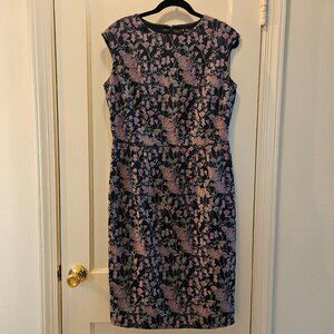 Sleeveless/cap sleeve pencil dress in a floral brocade fabric. Dress has a navy background with a lavender/green/ivory floral print. Excellent used condition with no flaws. Hits just below the knee.