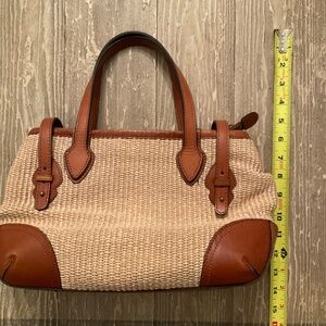 Brooks Brothers Spring/Summer Straw Handbag, with Tan Leather Handles and Trim. Interior pockets. Zipper and Strap Closure for security.