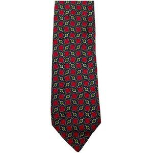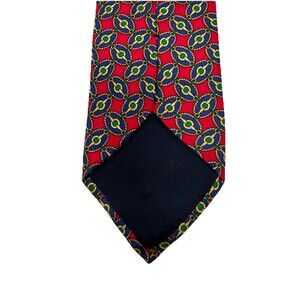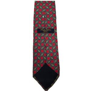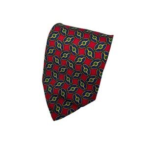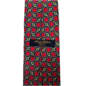 Elevate your wardrobe with this classic Brooks Brothers Makers tie. Made in the USA from 100% silk, this necktie features a vibrant red background adorned with an interlocking nautical rope chain pattern in green, yellow, and navy. A refined and bold accessory for any formal or professional setting. Gently used and in excellent condition.
