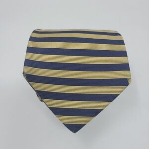 Men's black and gold striped silk necktie by Brooks Brothers Makers. Handmade silk tie is in excellent pre-owned condition overall; some wear on sides of tie. Please see close-up pictures for more details.
