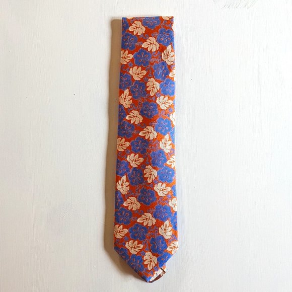 Brooks Brothers Tropical design tie. Coral background with blue hibiscus flower and monstera leaves. Like new.