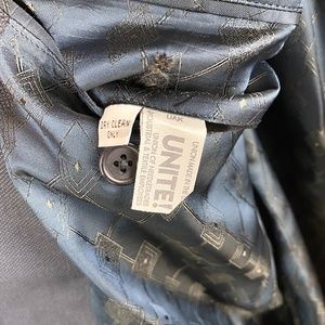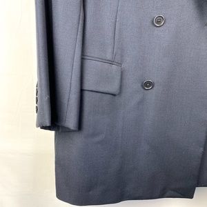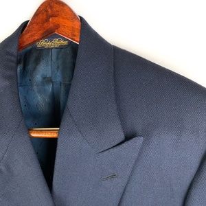 Brooks Brothers Mens 1818 Suit in Navy Blue - 1999-2000 Double Breasted 3 Button Front. 2 Front Hip Pockets with flaps. 2 Interior Pockets. Fully Lined. Made in USA. 4 Accent Button Cuffs. All wool fabric. Has tags of original owner on inside of pocket.