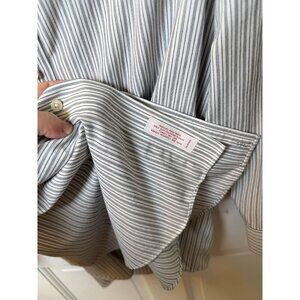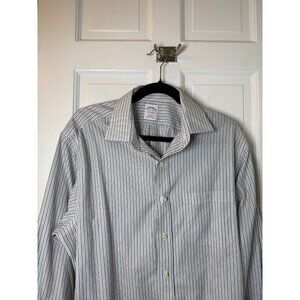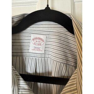 The product is a Brooks Brothers Men's Black & White Striped LS Button Dress Shirt in size 16 with a regular fit. It features a collared neckline, button closure, and long sleeves with a barrel cuff style. Made of cotton fabric, this dress shirt is machine washable and has a striped pattern, making it suitable for both casual and business occasions. With a chest size of 48 inches and a neck size of 16 inches, this shirt offers a classic and stylish look for any man's wardrobe.